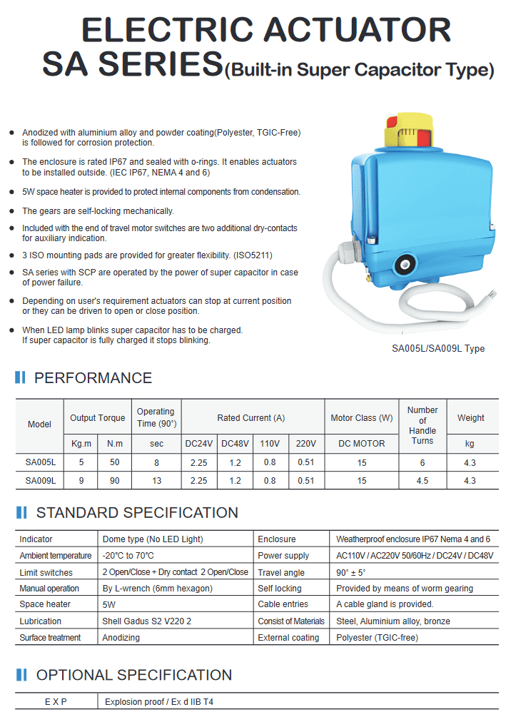 SA series actuators are suitable to be located in small spaces with a range of 30Nm torque and designed for butterfly valve, ball valve, damper and automation of rotary machines.
