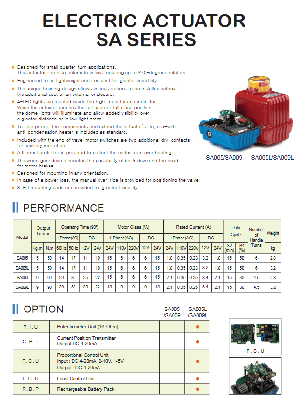 SA series actuators are suitable to be located in small spaces with a range of 30Nm torque and designed for butterfly valve, ball valve, damper and automation of rotary machines.